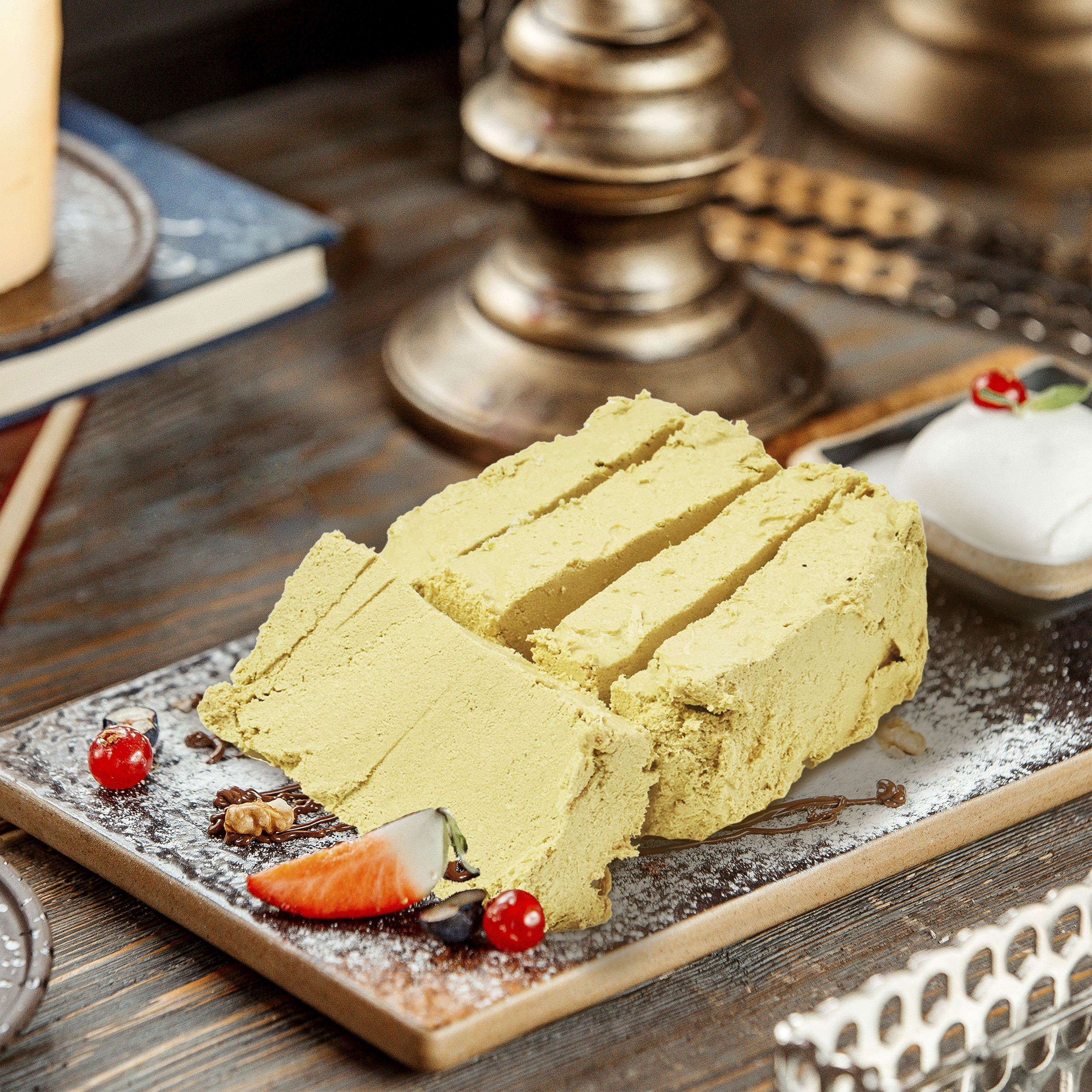 Основний інгредієнт — тахіні, паста з подрібненого кунжуту. Саме вона формує характерну текстуру халви: ніжну, волокнисту та злегка розсипчасту. До складу також входять підсолоджувачі та натуральні добавки — наприклад, фісташки або фініковий сироп. Якісна тахінна халва не потребує штучних ароматизаторів чи підсилювачів смаку, адже природний аромат кунжуту вже сам по собі насичений і глибокий.
